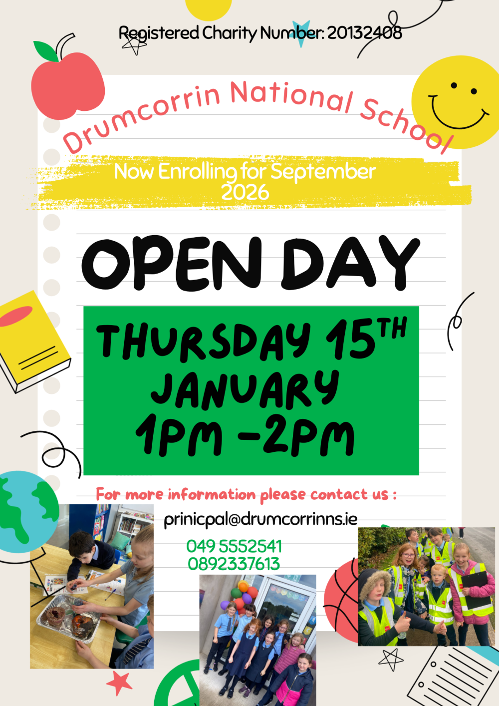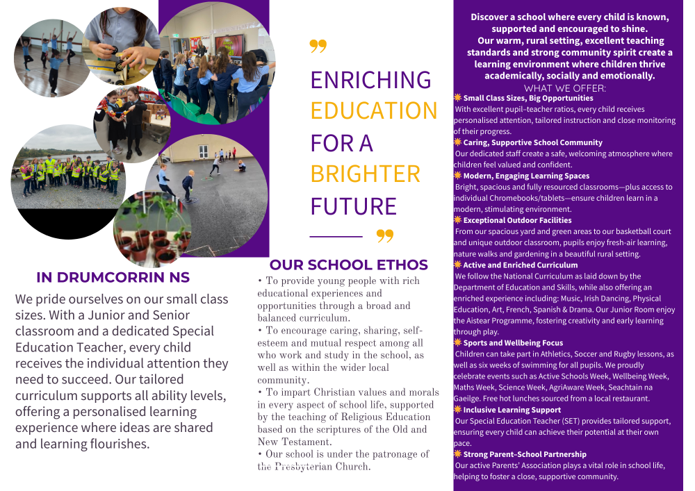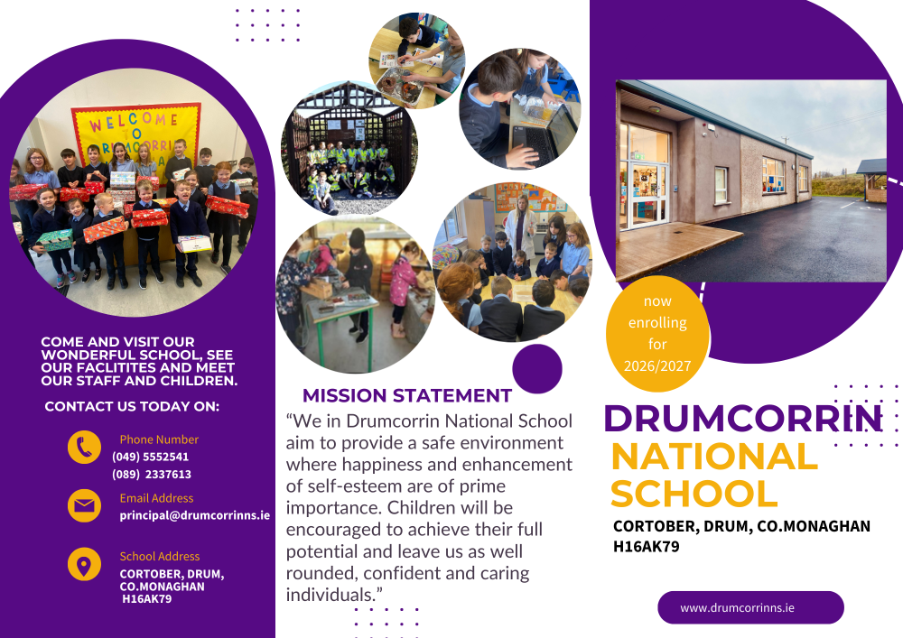 We are a co-educational primary school located in the heart of Drum Village, Co. Monaghan, under the patronage of the Monaghan Presbytery of the Presbyterian Church in Ireland. Our school has a proud and long-standing presence in the community, having first opened its doors to pupils in 1980. For over 45 years, Drumcorrin National School has welcomed, educated, and cared for children from our local area while upholding the Christian ethos and values entrusted to us.